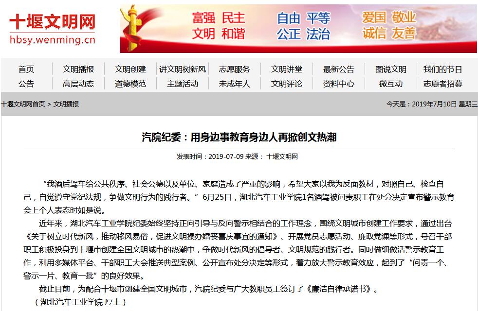 【十堰文明网】汽院纪委:用身边事教育身边人再掀创文热潮