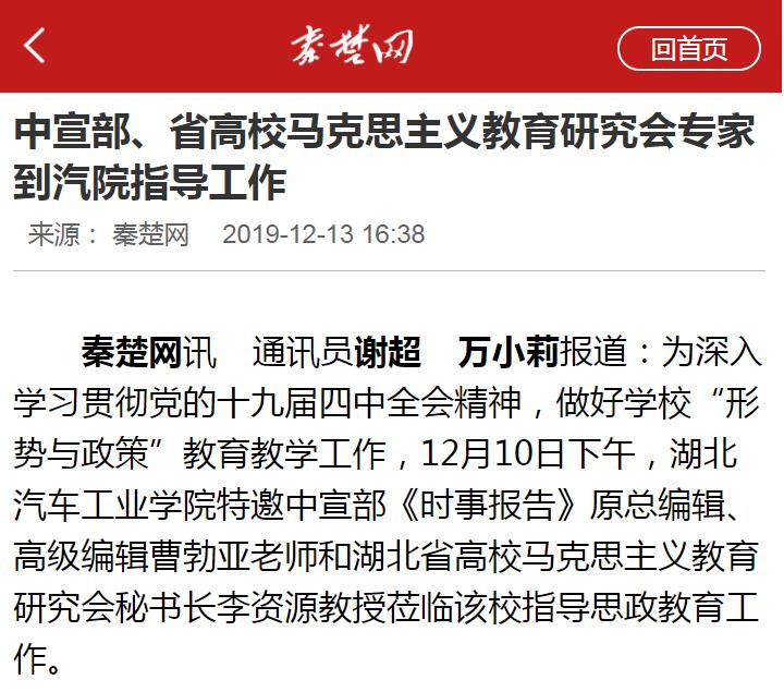 【秦楚网】中宣部、省高校马克思主义教育研究会专家到汽院指导工作